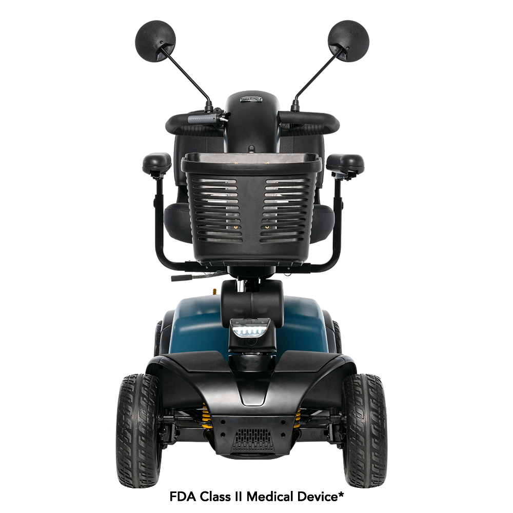 | FDA Class II medical device**The Pride Victory Platinum gives you Pride's exclusive EZ Turn technology which allows for 3-wheel turning ability while maintaining 4-wheel stability. Feather touch disassembly provides the ultimate quick transport system with a delta tiller that has wraparound handles. Charge360 magnetic charging port requires minimal dexterity. The Victory Platinum has full front and rear suspension with non-scuffing flat-free tires. And the